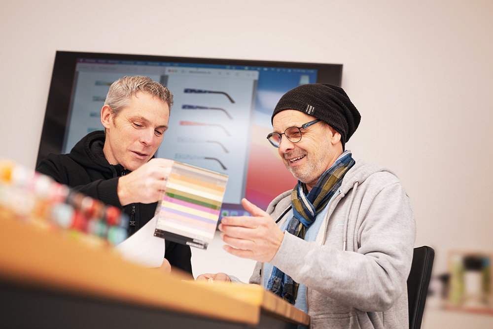 Grafikdesigner Oliver Hartmann (rechts) im Gespräch mit Koberg & Tente-Geschäftsführer Frank Tente. Am Bügel seiner Brille: ein kleiner Oldtimer. Kein Zufall. Er fährt selbst einen. Individualität auf nur wenigen Zentimetern.
