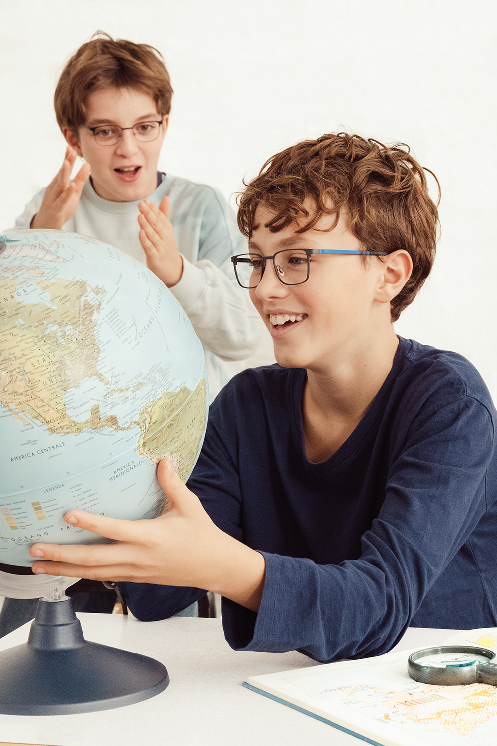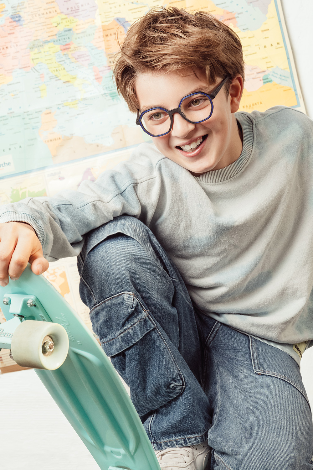 TITANFLEX by ESCHENBACH. In einer Schulstunde um die Welt. Für seine imaginären Abenteuer in ferne Länder setzt Iago auf das Modell „830152“ aus der Linie „New Mobility“ von Titanflex by Eschenbach – eine gradlinige Metallfassung, federleichte zwölf Gramm, erhältlich in verschiedenen Größen und vier Farben. Sicherheit und Präzision stehen an erster Stelle: Die Brille ist helmtauglich und das „Easy Temple Shortening“-System passt die Bügellänge unkompliziert an. Titanflex-Kinderbrillen sitzen so immer perfekt und begleiten kleine Entdecker zuverlässig durch Schule und Freizeit – bereit für jedes Abenteuer.
