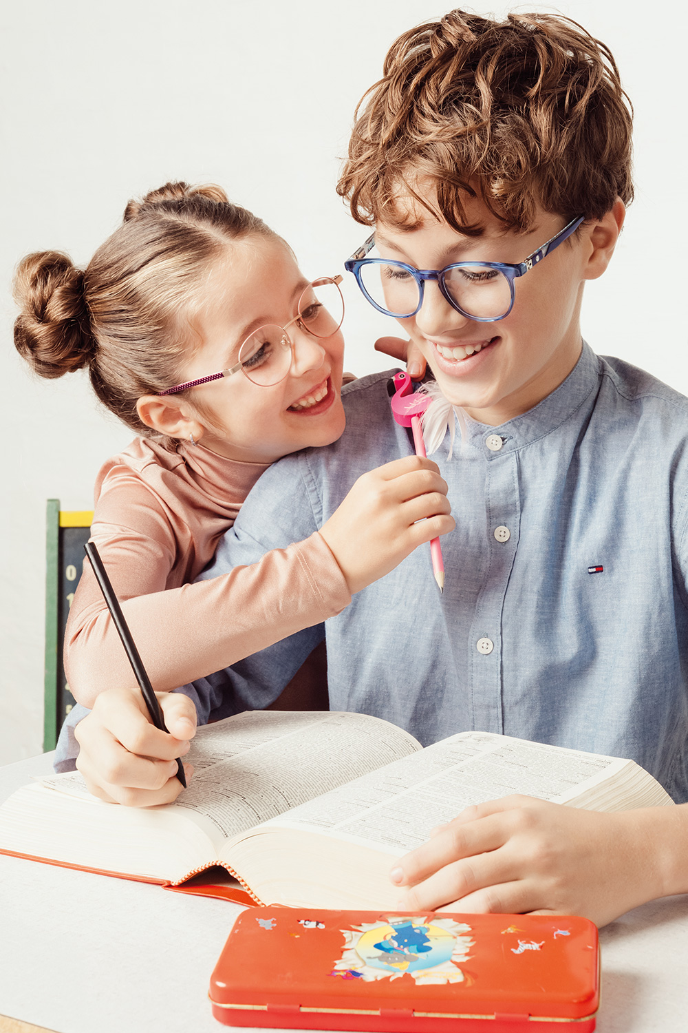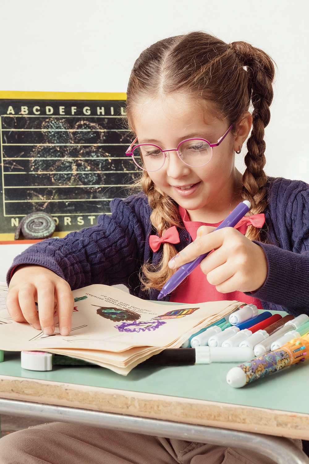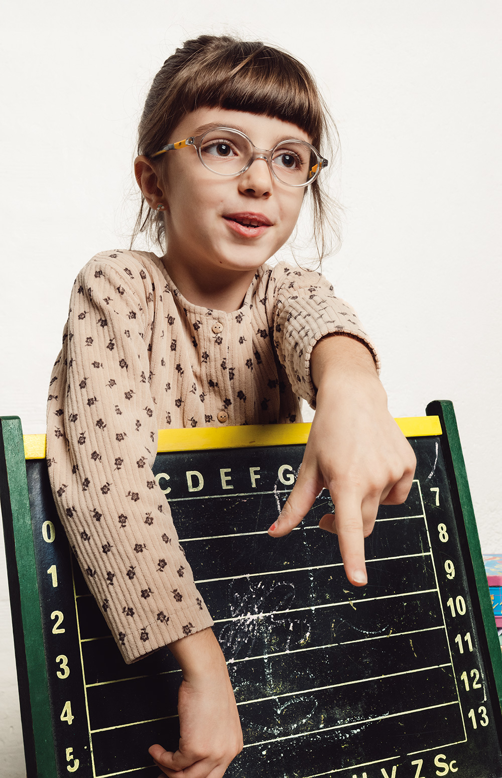 IVKO. Spaß im Klassenzimmer. Kleine Scherze machen große Freude – und mit seiner Fantasie reist Iago mitten im Unterricht in ferne Galaxien. Er trägt die Vollrand-Kunststofffassung „SWAA131“ von IVKO, eine trendige Pantoform aus der „Star-Wars“-Linie. Die Auswahl an Designs, Farben und Motiven ist riesig – hier trifft Filmspaß auf stylisches Brillendesign. Nina ist sofort dabei: Ihre runde Fassung der Linie „Lillebi“ aus Edelstahl punktet mit dekorativen Bügel-Details und ist in Gold-Rosa, Gold-Grün und Roségold erhältlich – perfekt für kleine Trendsetterinnen im Klassenzimmer.