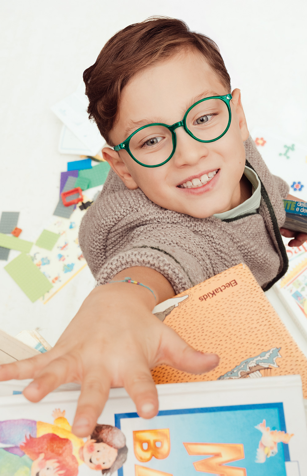 PRICON. Lesestoff mit Style. Arturo liebt Abenteuer zwischen zwei Buchdeckeln – und mit dem Modell „peso piuma F049948“ von Pricon wird jede Lesestunde noch entspannter. Die Brille ist angenehm leicht, sitzt bequem auf der Nase und sorgt auch bei langen Lesestunden für entspannten Tragekomfort. Besonders praktisch: Mit dem magnetischen Sonnenclip wird die Fassung blitzschnell zum zuverlässigen Sonnenschutz für empfindliche Kinderaugen. Erhältlich in vier Farben: kräftiges Grün, Schwarz, Rot und Blau – ein unkomplizierter Begleiter für Schule, Freizeit und spannende Lesestunden.